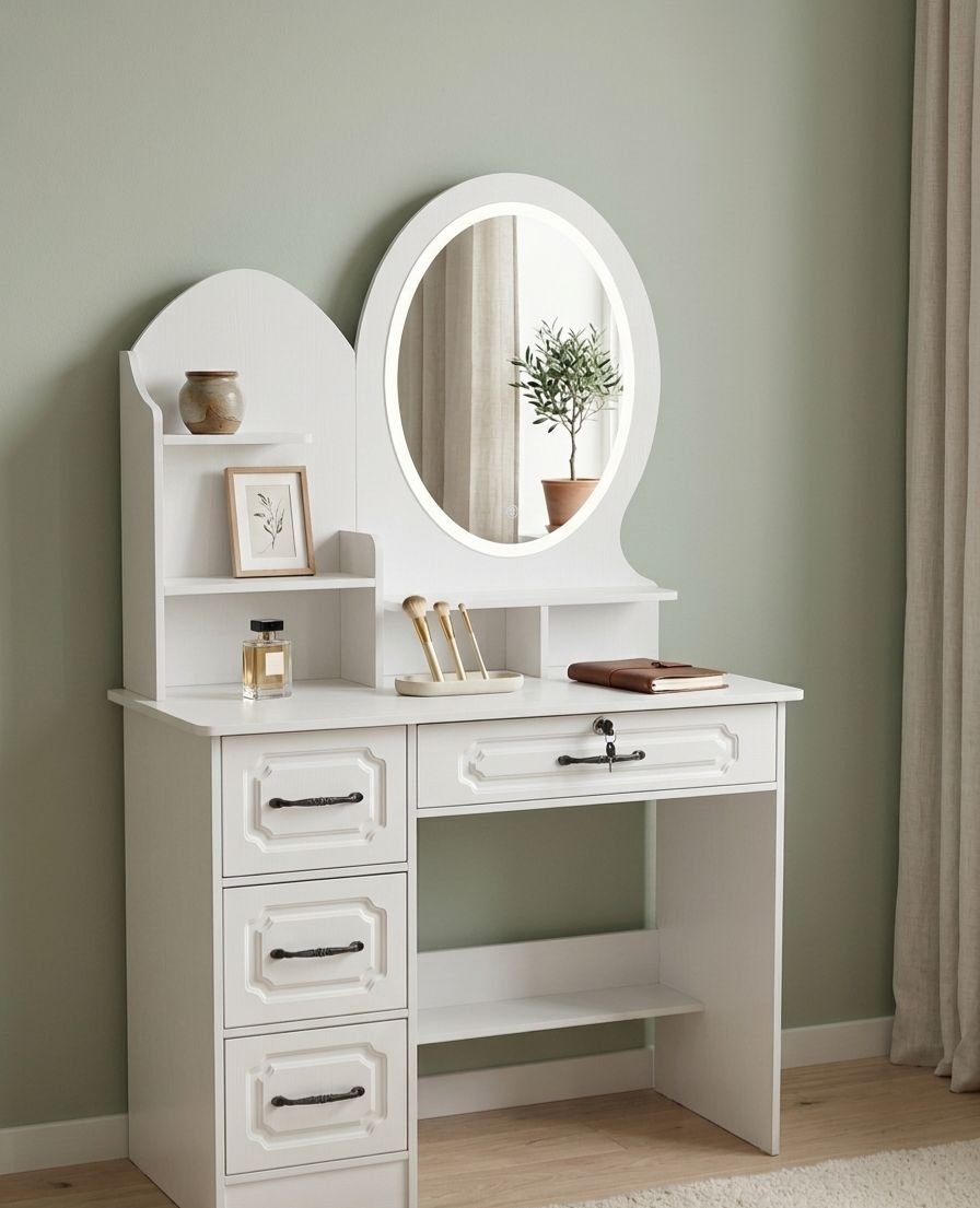 Coiffeuse élégante au grand miroir led ovale, rangements modulaires et tiroirs profonds,. Finition blanche raffinée et poignées noires pour une touche chic et moderne.